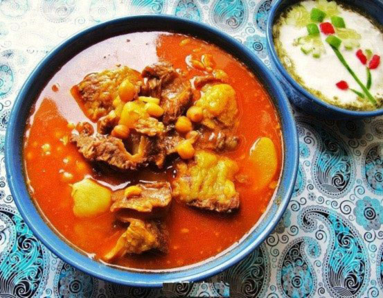* وقتی که گوشت، نخود و لوبیا کاملا پخته‌ شدند، سیب‌زمینی‌ها را پوست کنده و به آنها اضافه کنید.
