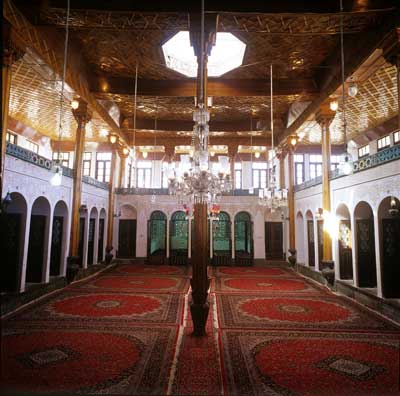 در سقف حیاط یک نورگیر زیبای ۸ ضلعی به همراه پنجره های سراسری بالای دیوار حیاط روشنائی فضای تعزیه را تامین می کند. تالار پنج دری زیبائی که در جبهه شمالی حیاط سرپوشیده قرار دارد محل دفن مرحوم ملک التجار و همسر اوست که بنا به وصیت وی در این محل به خاک سپرده شده اند.