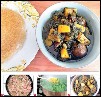 در آخر نمک و محلول زعفران را اضافه و خورش را بعد از یکی دو جوش از حرارت بردارید.