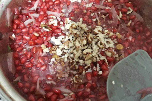 در این مرحله از تهیه خورشت سیر و انار مازندرانی باید حبه های سیر را به صورت خلالی برش بزنید. به پیازها اضافه کنید و با هم تفت دهید. کمی بعد دانه های انار را در تابه بریزید.مغز گردوهای خرد شده را به تابه اضافه کنید.