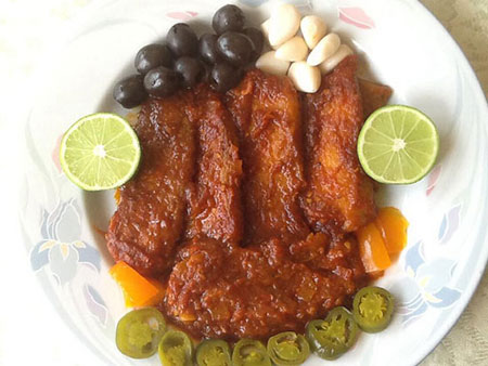پیاز درشت نگین شده را سرخ میکنیم یک قاشق مربا خورى رب گوجه فرنگى و ادویه اضافه میکنیم وتفت میدهیم.سپس دو عدد گوجه فرنگى رنده یا ریز شده را به ان اضافه میکنیم میگذاریم کمى آبش جمع شود.مثل املت که جا افتاد، چهار تکه ماهى متوسط سرخ شده را اضافه میکنیم بعد از یک جوش نصف استکان رب خرما اضافه میکنیم.با شعله کم ده دقیقه که جوش آید و جا افتاد با برنج نوش جان کنید…