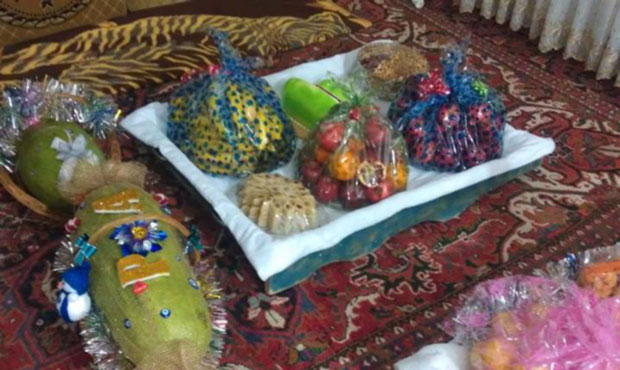 محتویات خوانچه ها عبارتند از شیرینی، پرتقال، سیب، انار، هندوانه، آیینه و پارچه که با پولک و تور تزیین می شود. هنگام غروب، زنان فامیل هدایایی به رسم یاری به منزل داماد آورده و به جشن و پایکوبی می پردازند.