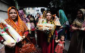 در مراسم عروسی سنتی بوشهری، خانواده عروس و داماد با لباسهای محلی در حالی که جهیزیه عروس و داماد و لوازم سفره عقد را در دست دارند، با رقص و موسیقی محلی در اطراف عروس و داماد شادی میکنند.