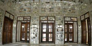 سفره خانه این سالن دارای تزئینات گچبری و نقاشی زیبائی است. اشکال مختلف از قبیل ملائکه به عنوان مظهر پاکی و کله شیر که حاکی از قدرت و دلاوری است و مناظر زیبا از شکار و گچبری های گل و بوته در حاشیه بزرگ و کوچک آن است. سقف چوبی و به شکل قاب بندی است و دارای در و پنجره های سیم کوبی شده است. در کنار سفره خانه اتاقی به نام آیینه خانه قرار دارد که به صورت باشکوهی تزئین شده است.