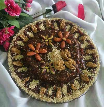 در صورت تمایل حدود ۲ قاشق گلاب اضافه کنید و سریع هم بزنید اگر موادتان سفت بود آب جوش اضافه کنید تا به غلظت مثل فرنی برسد نباید مثل حلوا سفت و خودش را جمع کند و از ظرف جدا شود به حالت فرنی که در آمد از روی حرارت بردارید و آماده سرو است بسیار مقوی و گرم کننده بدن در فصل سرما است اگر محیط بیرون خنک است که هیچ و گرنه حتما داخل یخچال نگهداری کنید زیرا خرما در محیط گرم ترش می شود.