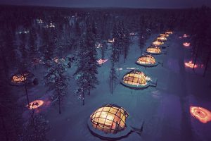 در ناحیه لاپلاند در شمال فنلاند کلبه هایی شبیه خانه اسکیموها و به صورت جدا از هم وجود دارد که قطعا تجربه ای خاص و زیبا از لذت نوشیدن یک چای گرم در میان سرما و یخبندان زمستانی این منطقه به شما خواهد داد. در ساخت این کلبهها از شیشههای حرارتی استفاده شده که امکان مشاهده آسمان را برای ساکنان فراهم مینماید. در نتیجه لازم نیست نگران پنجرههای یخ بسته یا مه گرفته باشید که دید شما را محدود میکنند. اگرچه این کلبهها کوچک و مدور هستند ولی محلی امن و راحت را در اختیار مهمانان قرار میدهند. همچنین با اقامت در این ایگلوها امکانات دیگری نیز در دسترس شماست از جمله رستوران برفی و سورتمه سواری با گوزنهای شمالی که خالی از لطف نخواهد بود.
