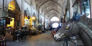 On the top of this great gate, as a symbol of the Battle of good and evil, the splendorous mosaic work represents two hunters with human bodies, tiger legs and each aiming an arrow to their dragon tail as a Sagittarius zodiac sign. Historian declare that this was the month that Isfahan was founded.On the top of the Qeysarie Gate, not so long ago, there used to be structure called ”Nagharehkhaneh”, where music would be played at sunrise and sunset.In the middle of the portal, there is a painting of Shah Abbas at war with the Uzbeks.  Other paintings resemble some hunting frescos painted by European artists. Unfortunately, too much direct sun light along with humid condition have caused some colours of the paintings to fade.The famous Persian Moaragh mosaic tilework can be seen on the portal and the sides of the corridors. There is a poem from, Sa’di, the famous Persian poet written on the side walls. Each couplet on each side, facing the other.The grand Bazaar of Isfahan, itself is a complete covered town. Each part of this Bazaar including; cross roads which are called Char-Su (four directions), Caravansaries with rectangular shaped open courtyards and smaller places similar to caravansaries, called Timcheh have certain specifications.